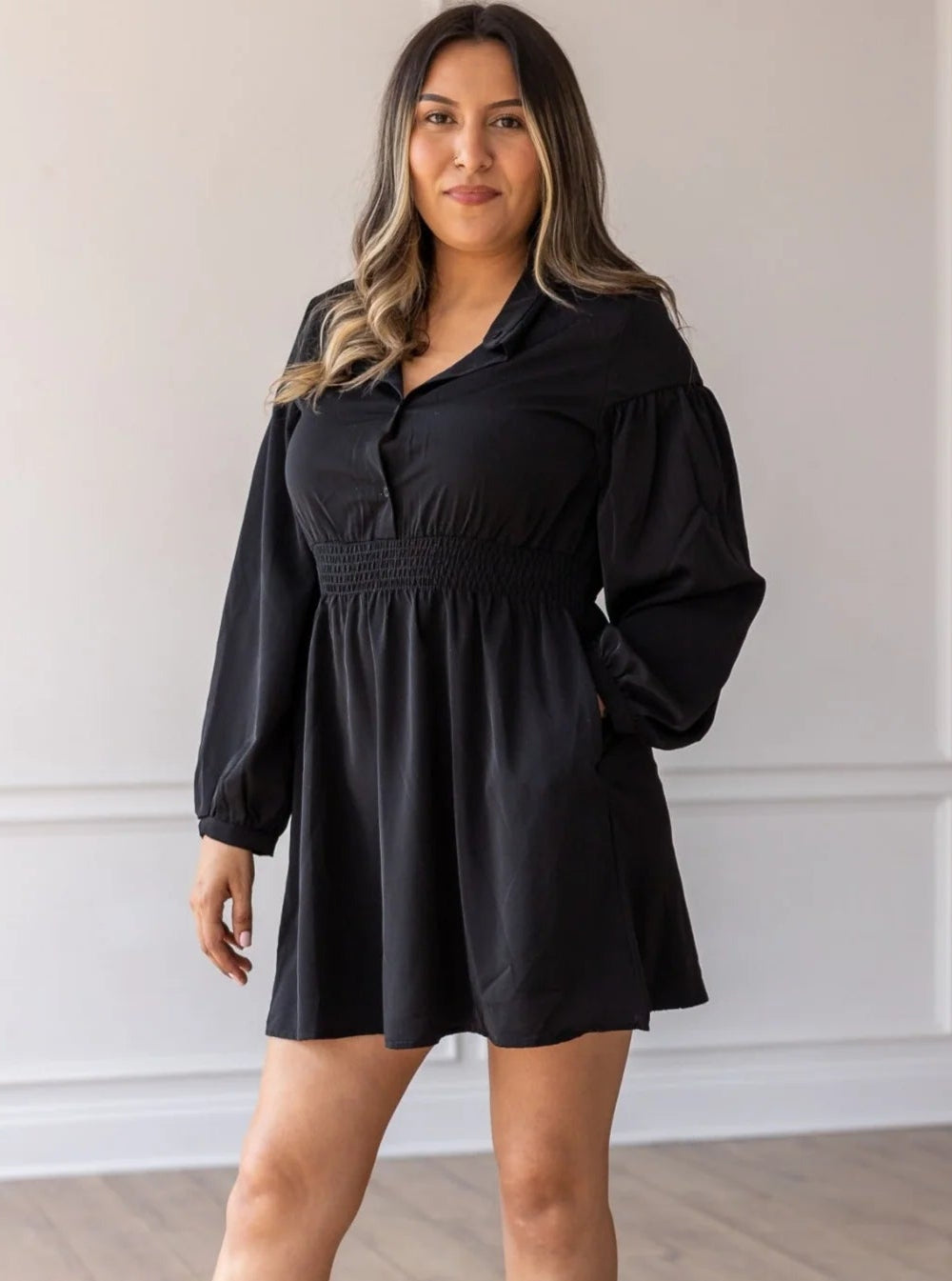 Effortlessly elevate your style with our Black Button Down Dress! The elastic waistband highlights your curves while the pockets add a touch of practicality. Made with 100% polyester, this dress is both comfortable and chic. Perfect for any occasion, dress it up or down for a versatile and flattering look.