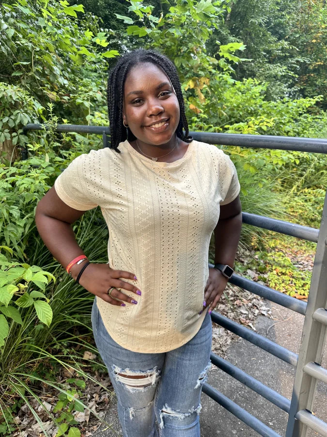 Elevate your everyday style with our Eyelet Batwing Sleeve Top! Designed with a crew neck and short sleeves, this top is perfect for any casual occasion. The eyelet detailing adds a touch of feminine charm. A must-have addition for your wardrobe!