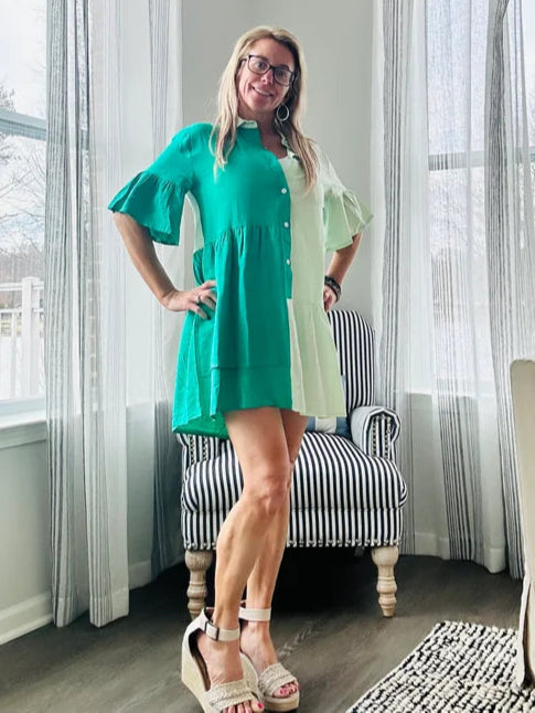 Elevate your wardrobe with our Green Color Block Button Front Dress! Made with a luxurious blend of 80% Polyester and 20% Elastane, this dress features a flattering button front design and is crafted from high-quality polyester material for ultimate comfort and style. Make a statement and turn heads in this must-have dress!