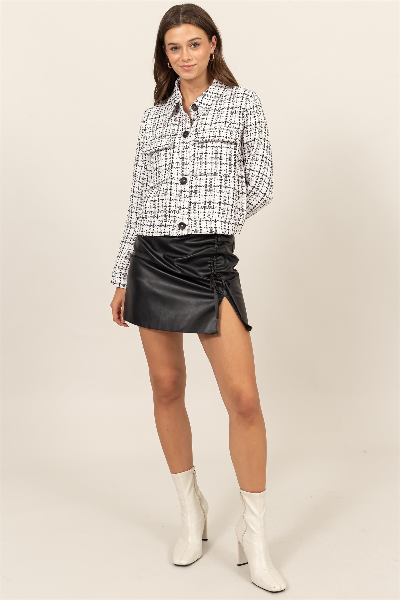 Elevate your style with our classic Tweed Button Up Jacket. With a distinctive black and white pattern, this jacket offers a structured fit and front button closures for a polished look. The textured fabric and chest pocket details add a touch of sophistication to any outfit. Perfect for both casual and professional wear!